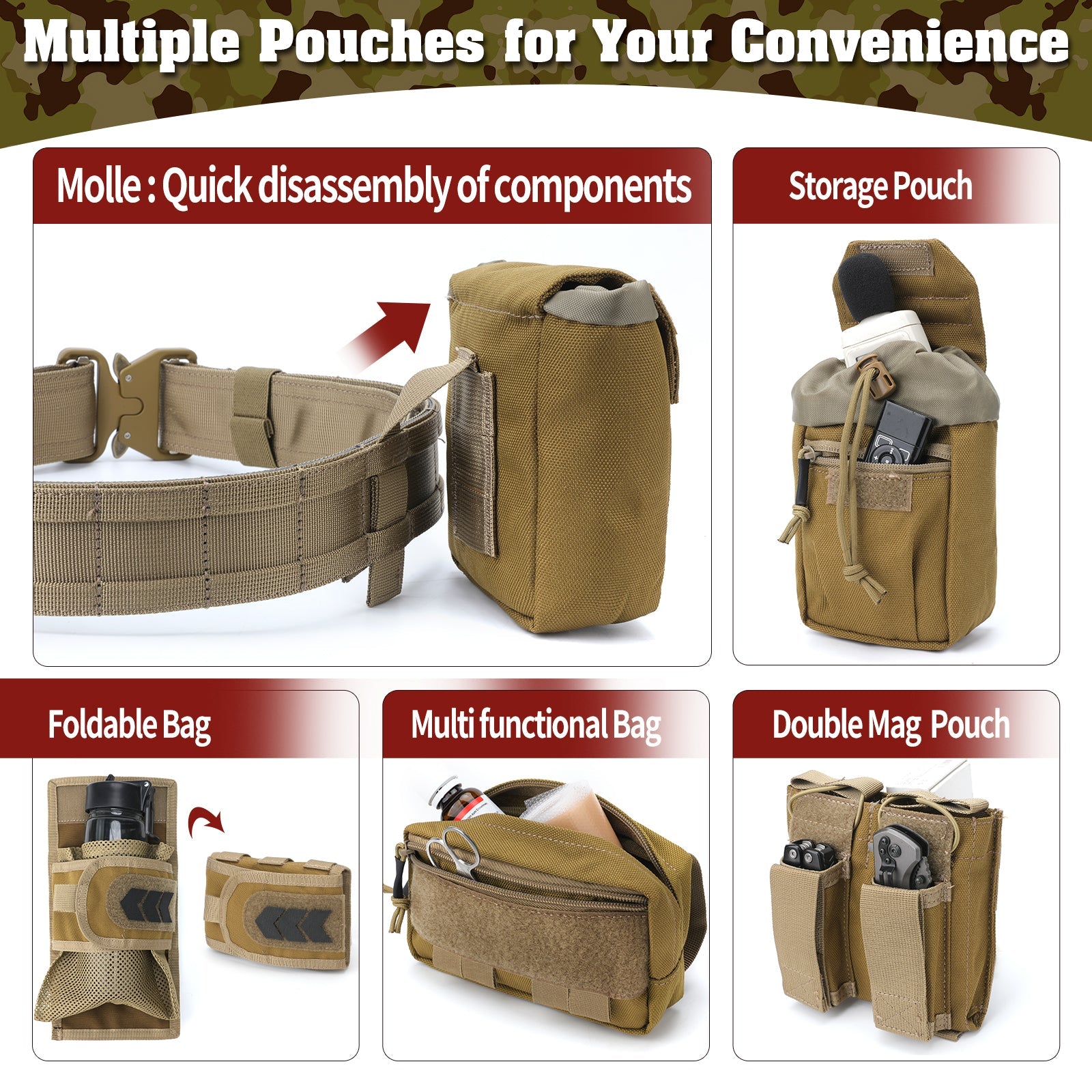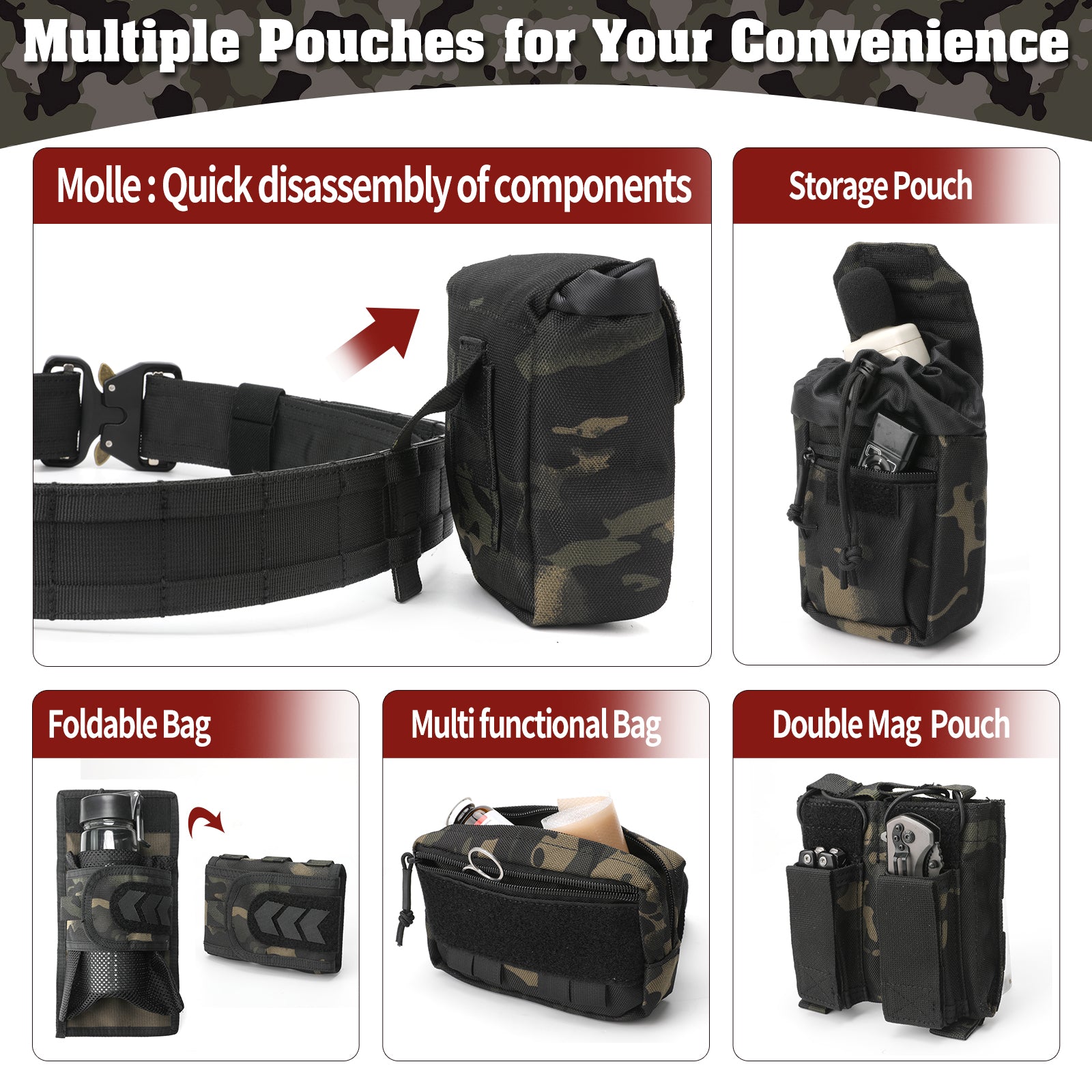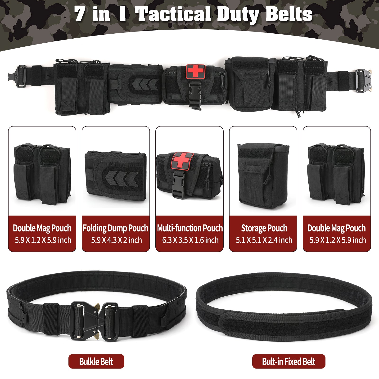 The Elite Survival TWS 5 in 1 Quick Release Tactical Duty Belt provides a strong, stable platform for your Multifunctional use. Modular versatile design for police, security officers, and law enforcement. This multifunctional belt can also be used as a practical belt, combat belt, battle belt, police weapon belt, and tactical equipment. Made from 1000D nylon, it has good tear resistance. Different and multifunctional pockets can be removed so you can choose what you need. It can also be used as a normal everyday belt (fitting on its pants) when you remove all of the bags.