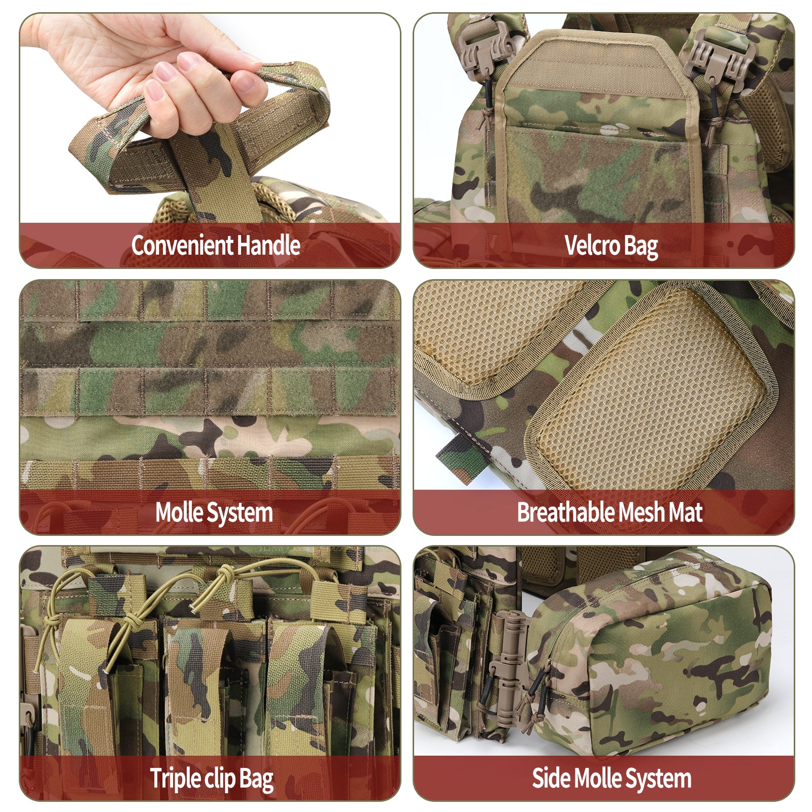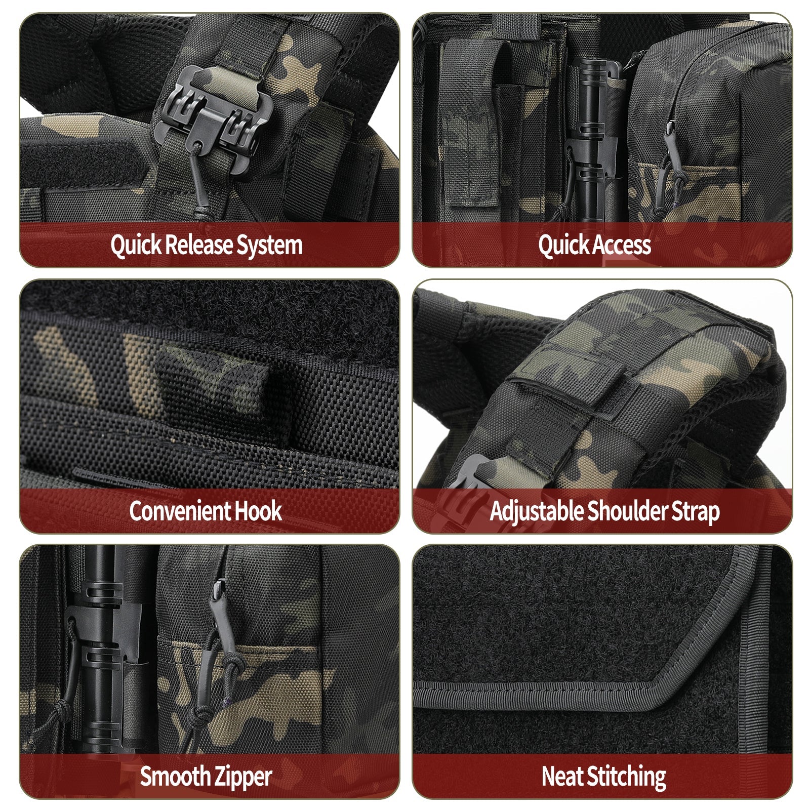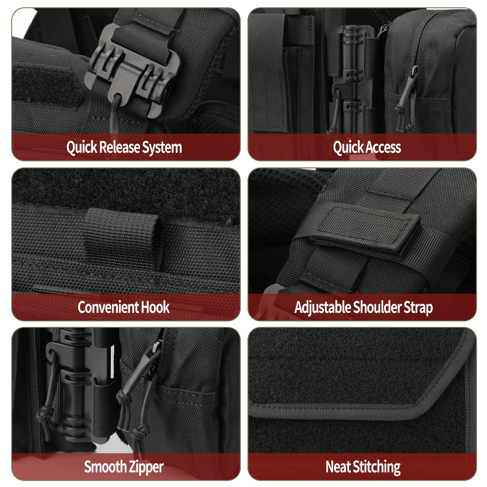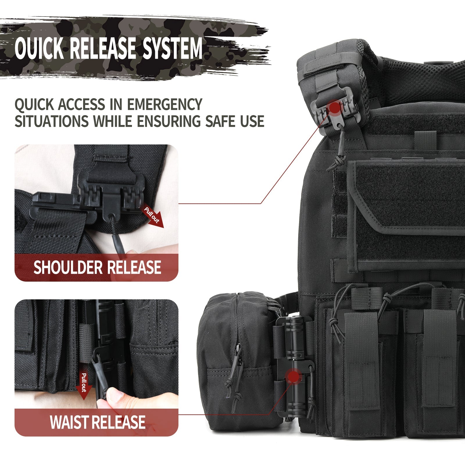 All Mission Quick Release Assault Tactical Vest is a combat-ready plate carrier designed for the best outcome in all types of tactical situations. Modular, Low Profile, and feature-packed. The vest includes 3 front mag pouches, 2 big-capacity bags and 1 velcro bag. It also carries a full-body MOLLE system for you to add on other essentials. This vest is made of 500D nylon with multiple patch panels and reinforced shoulder straps, which make it able to withstand any type of combat situation.